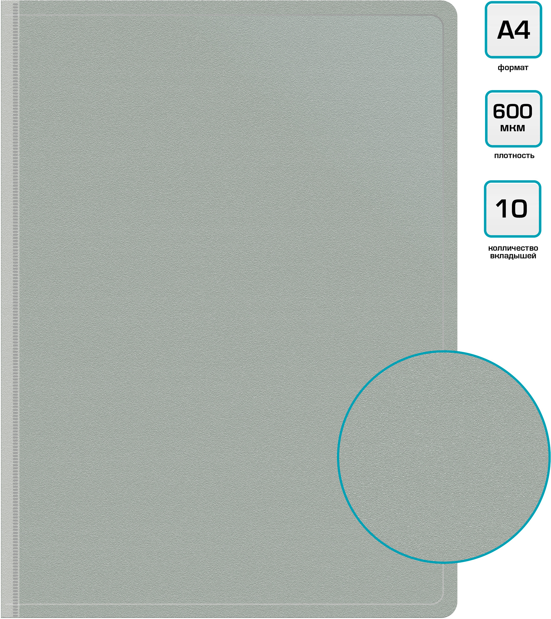 Папка с 10 прозр.вклад. Бюрократ -BPV10GREY A4 пластик 0.6мм торц.карм с бум. встав серый