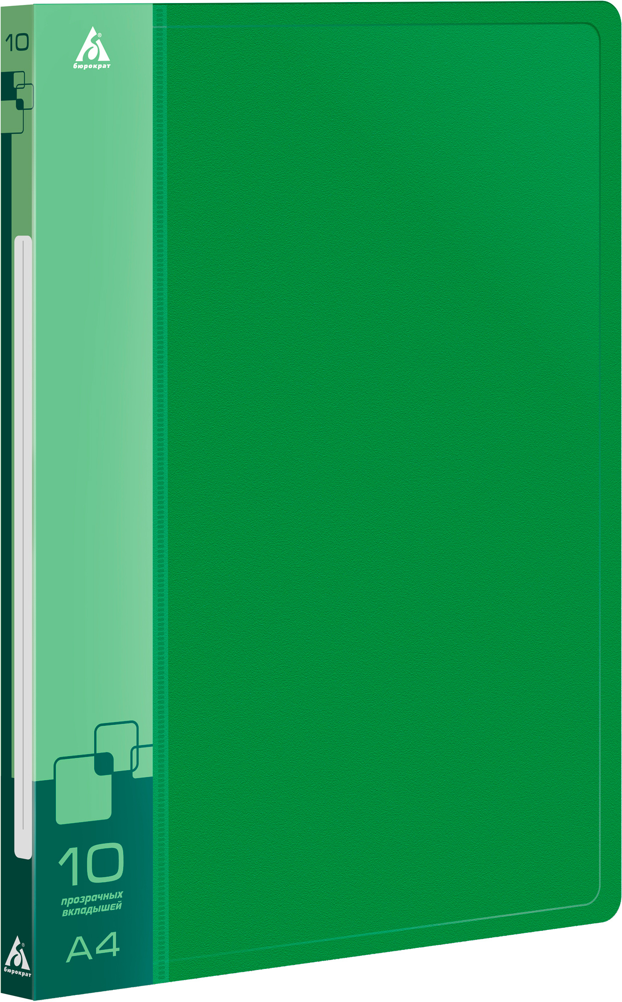Папка с 10 прозр.вклад. Бюрократ -BPV10GRN A4 пластик 0.6мм торц.карм с бум. встав зеленый