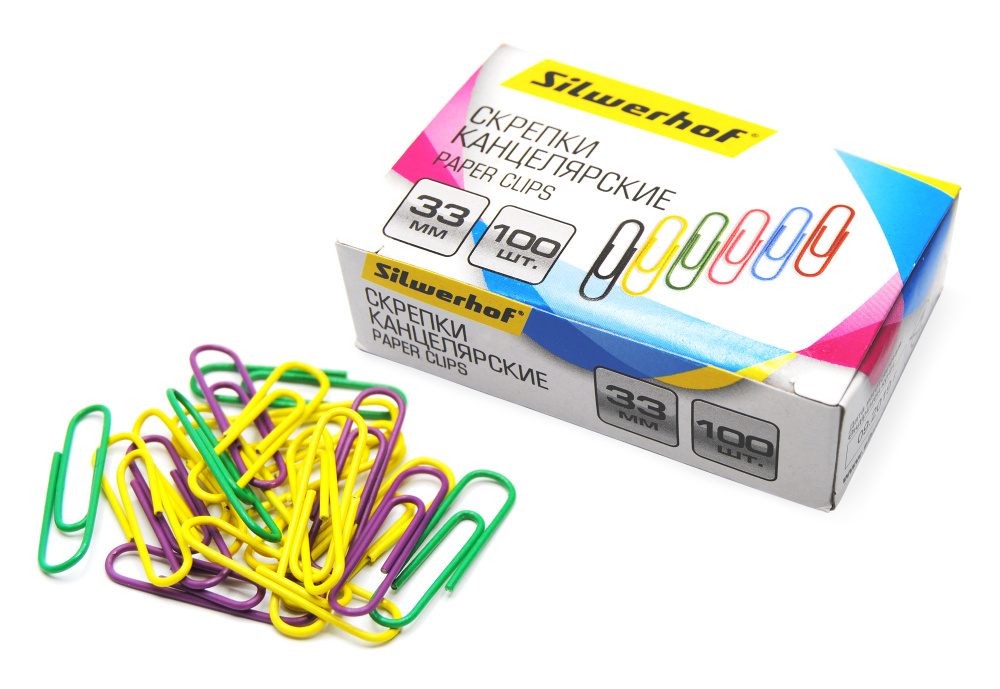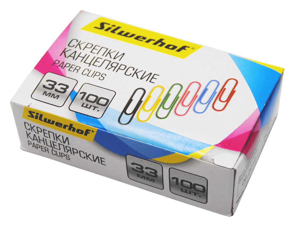 Скрепки Silwerhof 492021 металл пластиковая оболочка 33мм ассорти (упак.:100шт) картонная коробка